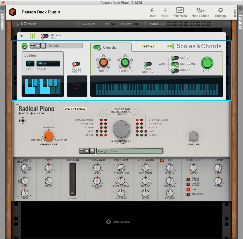 Tonight, I wanted to do a jam that had a more defined chord progression. So, I made some piano chord samples in Reason’s Radical Piano plugin. I know just enough music theory to figure out scales and chords, but my hands aren’t so dexterous on a keyboard…I learned note playing on xylophone and marimba in high school, so I’m about the equivalent of a two-finger typer when it comes to musical keyboards (I’m a pretty solid touch typist, for the record). Rather than muddle through playing and quantizing, I just used the chord player in Reason. I set the key to C minor, adjusted a couple parameters, and played around until I found a progression I liked. Then, after I froze and flattened the track (I was using Reason as a plugin in Ableton), I exported each chord as it’s own sample and dropped it in the Digitakt.