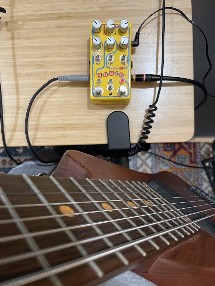 On the Habit, I started with a longer delay, a medium Spread and minimal Scan. The Scan starts to grate on my ears after a few cycles (the Habit has a 3-minute delay buffer, which can also function as a fixed looper). I also had it switched on Collect and had Feed turned on. If the preceding few sentences sound like nonsense, you can check out the manual here. The idea was to record over myself over time and get more and more washed out and ambient. This can also result in some clipping over time as the volume continues to increase. During the session I put on the filter and manually swept through it. Then switched over to reverse octave down delay.