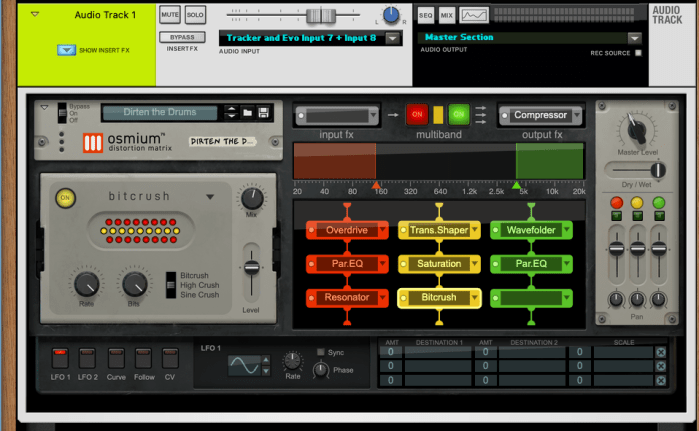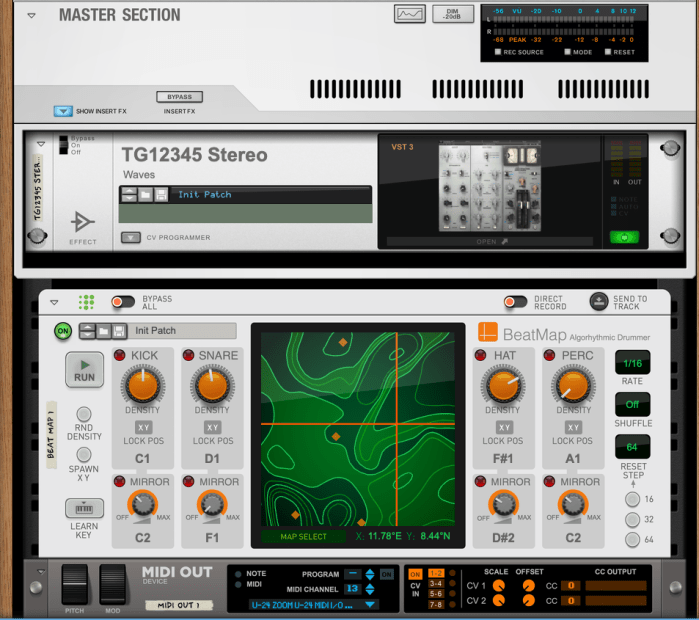 Yesterday, I set up my Emu Xtreme Lead-1 (old school, right?) to be controlled by Reason which was sending MIDI to the Emu via Reason’s Beat Map and Bassline Generator players (Reason’s players are such a great source of inspiration to get a track going). I then recorded the output of the Emu into an audio track in Reason with the new Osmium distortion effect adding some color. More coloration using the Waves TG12345 on the master out. Beat and screenshots below.