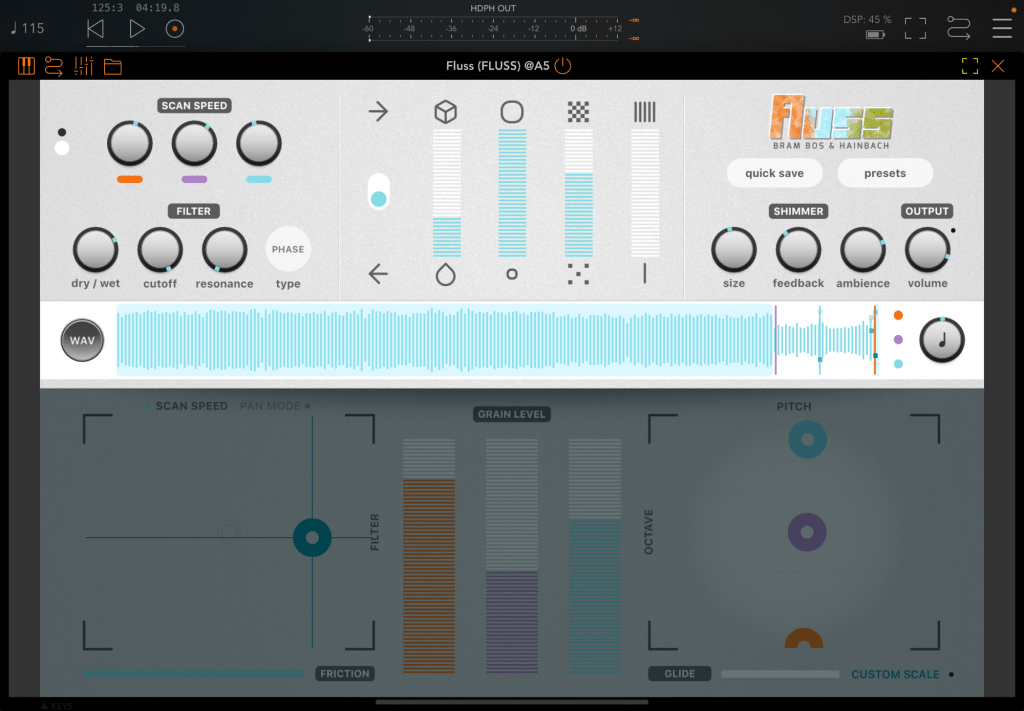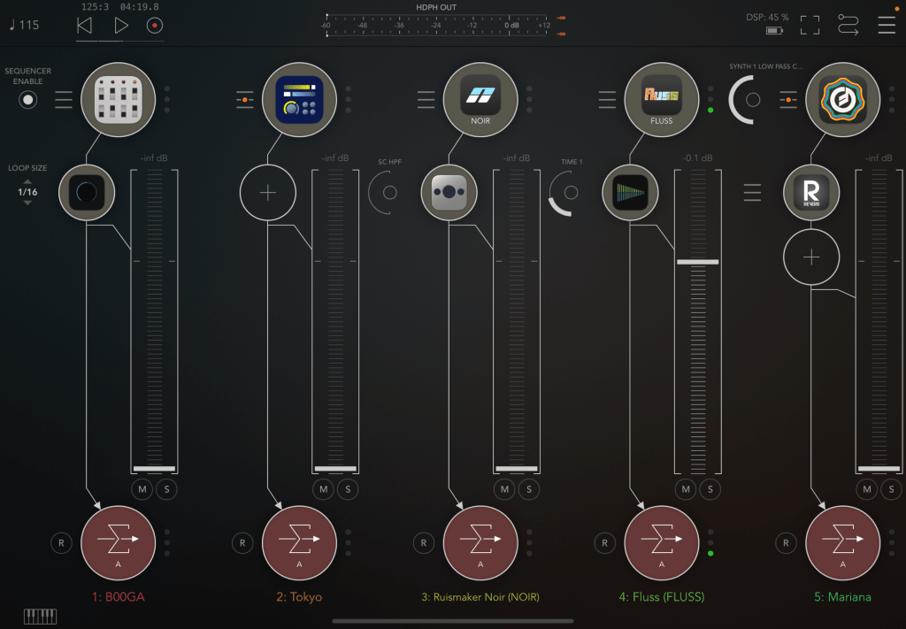 Back on the iPad today. Tweaked a preset in the new Audiothing B00GA app to create a glitchy rhythm (further glitched with Replicant 3). Then added some more drums with the Korg Gadget Tokyo app and Ruismaker Noir. After that, I dropped the back portion of yesterday’s track into Fluss to make the granular string sound. Finally added a Mariana part for more texture. Then recorded using the mixer in AUM to bring things in and out.